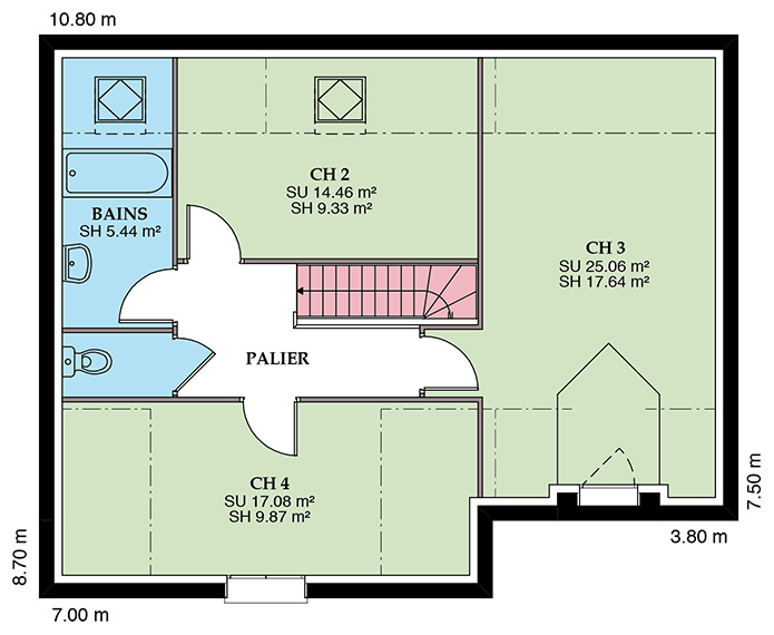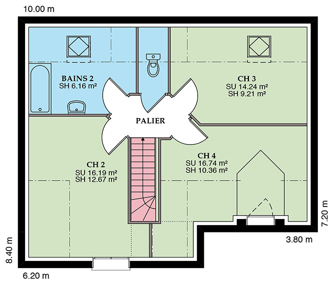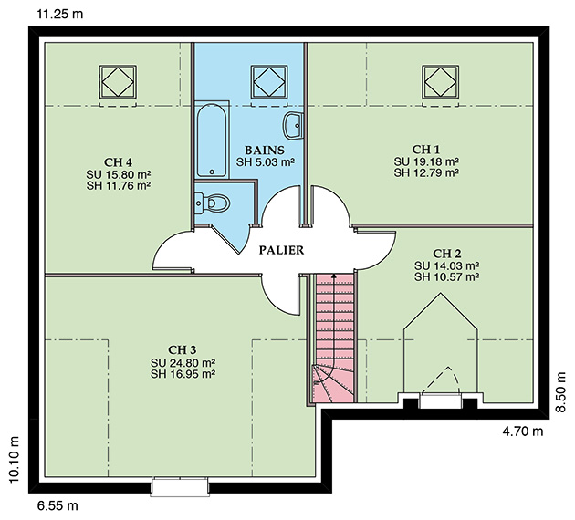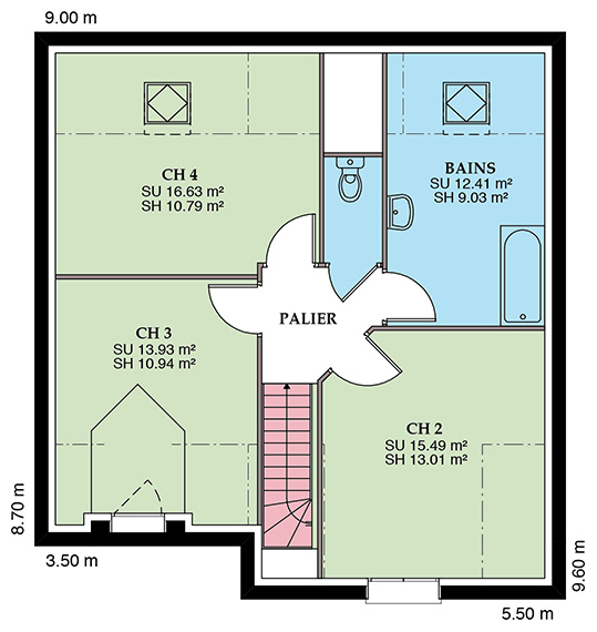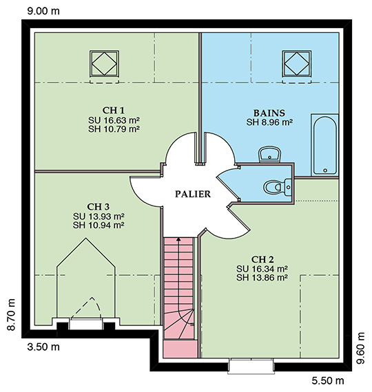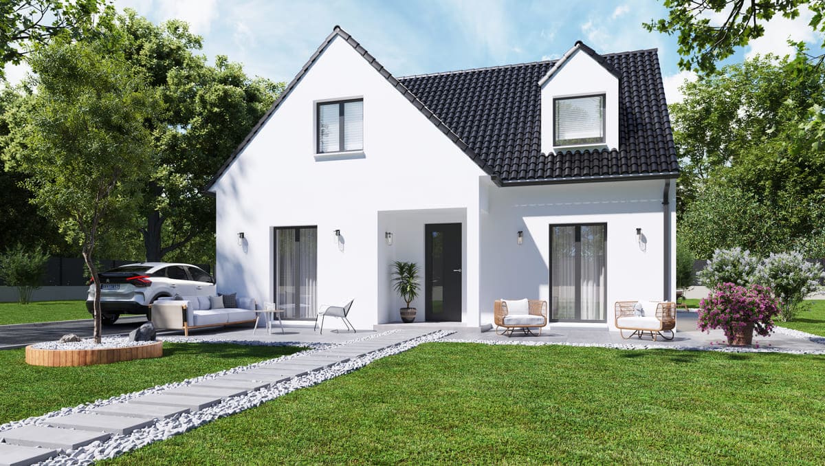 Modèle en L, avec avancée sur poteau pour couvrir l’entrée de la maison, cette maison traditionnelle à étage allie confort et optimisation de l’espace. Une faible emprise au sol lui permet de s’adapter aux terrains étroits. Sa très belle toiture à deux pans dotée d’ouvertures en velux ou lucarne lui confère un aspect cossu et rassurant.