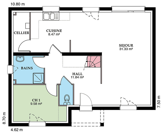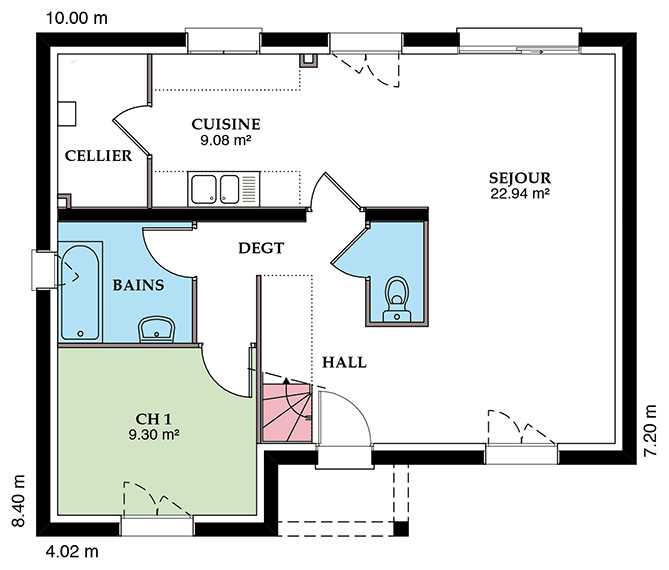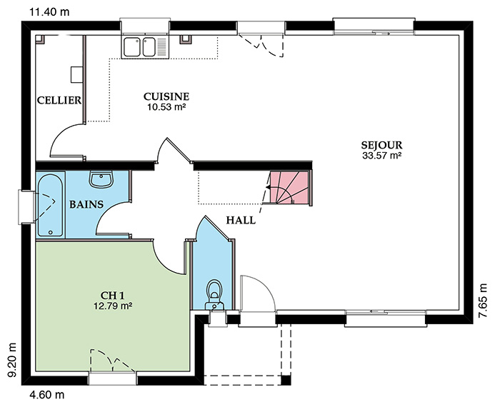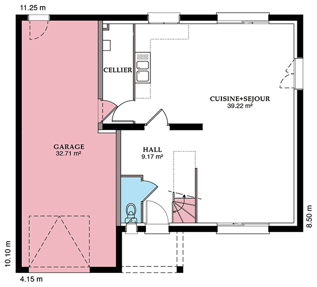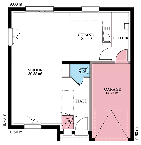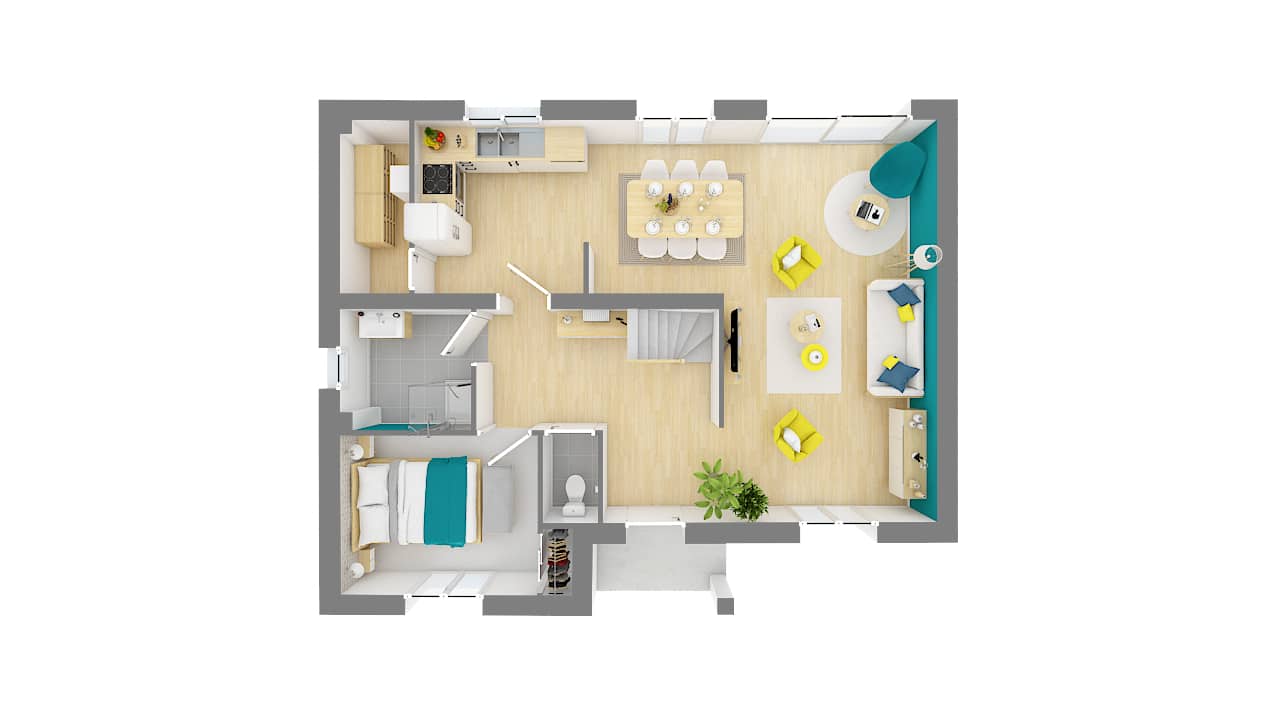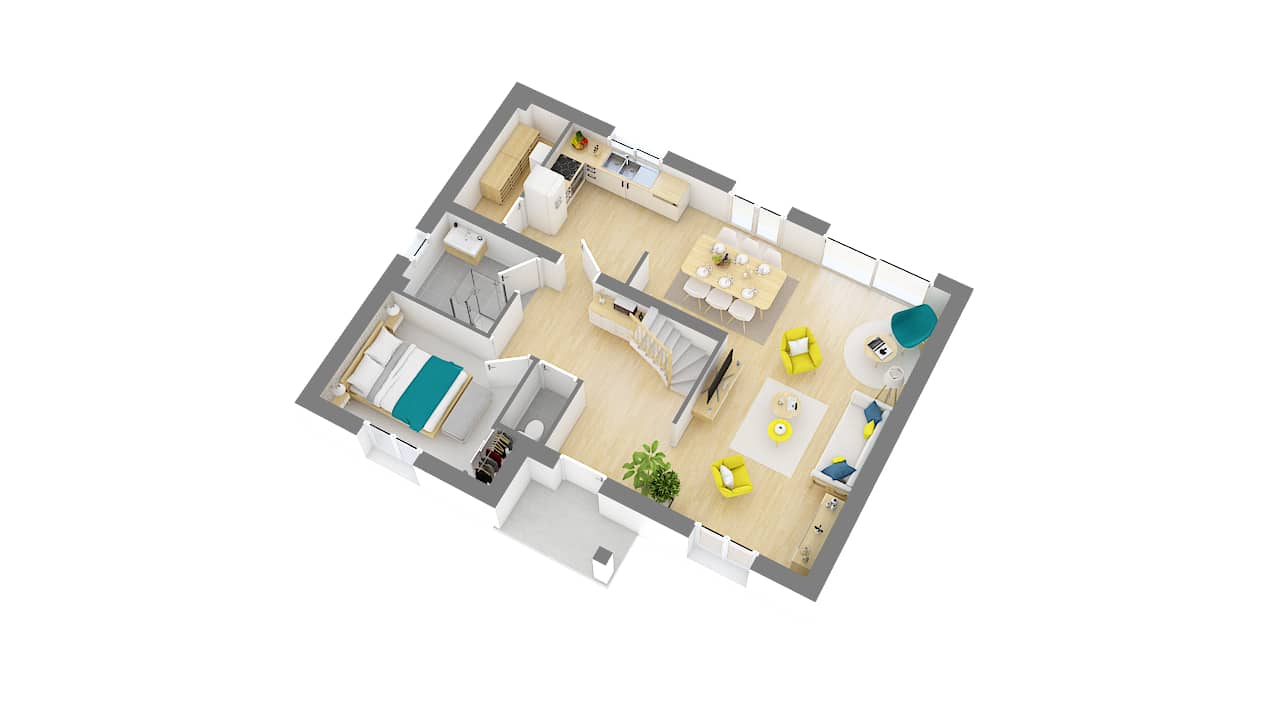 Les plans intérieurs de la Chacenière sont particulièrement bien pensés. Pratiques, ils proposent un grand garage intégré avec un accès cellier et cuisine. Le séjour traversant avec 2 grandes baies vitrées est très lumineux et spacieux. Un hall d’entrée nettement délimité accueille l’escalier en quart tournant pour accéder à l’étage.