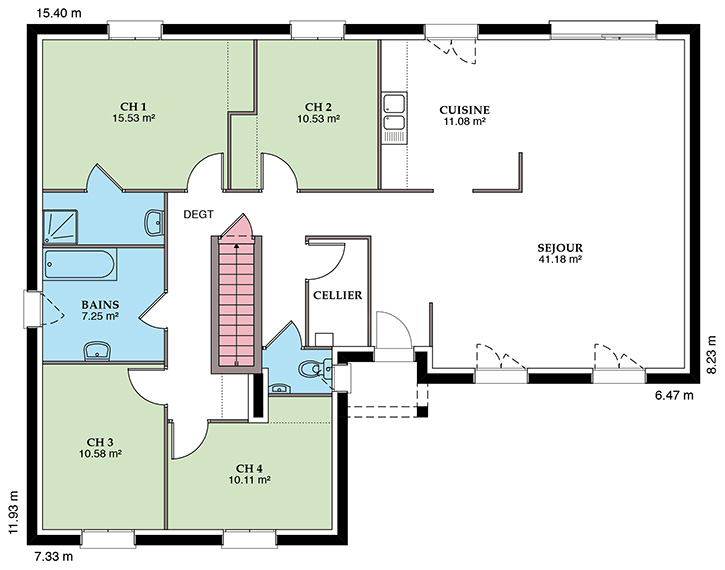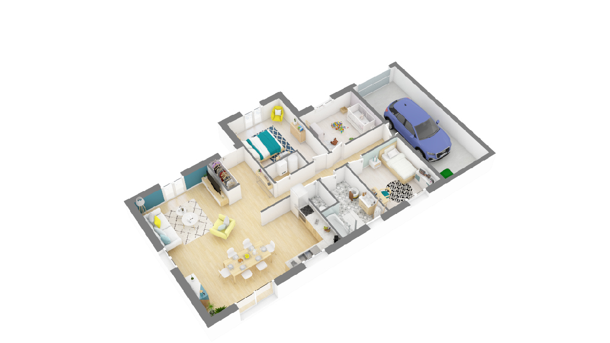 Choisissez votre logement tel que vous avez envie de le vivre et adaptez-le à vos besoins et la configuration de votre famille. Trois, quatre ou cinq chambres… un bureau éventuellement… une suite parentale avec salle d’eau privative… l’espace nuit annonce la couleur. Côté jour, un confortable séjour avec cuisine semi-ouverte et un hall d’entrée très pratique. Vous souhaitez un garage ? Vous pouvez l’intégrer à la maison ou construire celle-ci sur sous-sol.