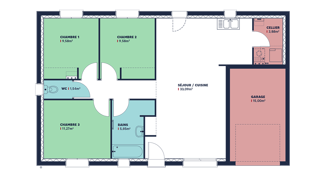 Focus est une série entrée de gamme à prix serré pour les petits budgets. Modèle classique de cette gamme, la Focus 79 est l’un de vos préférés. Simple et très pratique, c’est une maison de plain-pied idéale si vous débutez dans la vie et souhaitez fonder ou agrandir votre famille dans les meilleures conditions. Elle vous offre tout le nécessaire !