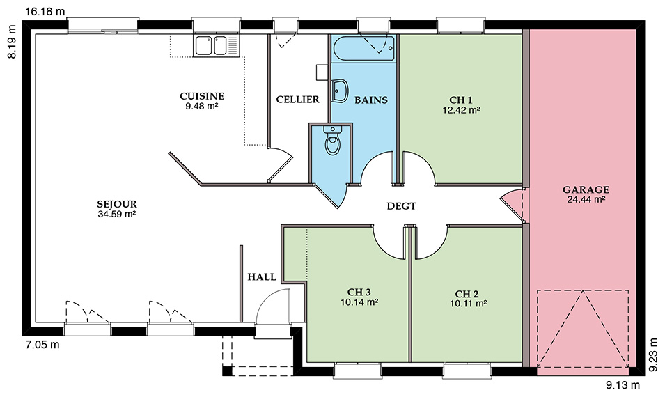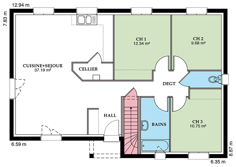 La Perrière est prévue pour vous simplifier la vie. Son intérieur est donc conçu pour être très fonctionnel. Un espace nuit avec trois chambres et sanitaires sur dégagement. Et un espace jour, offrant une belle et lumineuse pièce de vie avec sa cuisine ouverte et cellier communicant. Ce modèle est disponible avec ou sans garage selon vos besoins. La bi-coloration de l’enduit offre une touche personnelle à votre maison. De même que le joli porche sur entrée et la toiture en décroché, que vous pourrez choisir à 2 ou 4 pans.