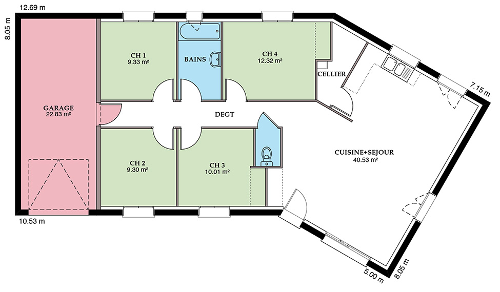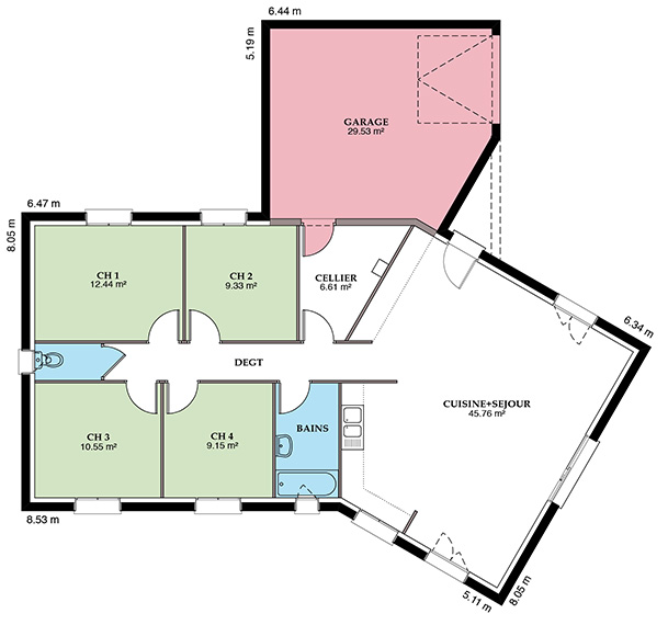 La Versière se décline en 3 ou 4 chambres avec ou sans garage selon vos envies et vos besoins. Sa forme en V permet une organisation optimisée de son plan, avec un coin nuit nettement délimité. Côté jour, vous disposerez d’un grand séjour, avec cuisine ouverte ou fermée. La baie vitrée et la porte-fenêtre vous permettent de profiter d’un maximum de lumière dans votre pièce à vivre spacieuse. Personnalisez également l’extérieur avec des jeux d’enduits bi-tons et choisissez votre toit, à 2 ou 4 pans ! Vous en ferez ainsi une demeure qui vous ressemble vraiment.