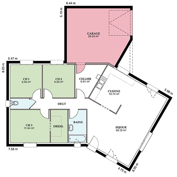 La Versière est le modèle en V phare de notre gamme. Cette maison traditionnelle de plain-pied très élégante s’adapte à de nombreux terrains. Parmi ses atouts, figure sa modularité et le jeu des options disponibles. Elle est proposée dans des versions de 90 m² à 122 m². C’est un logement familial très fonctionnel. À l’intérieur, tout est pensé pour votre bien-être.